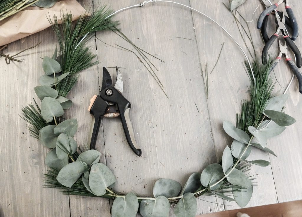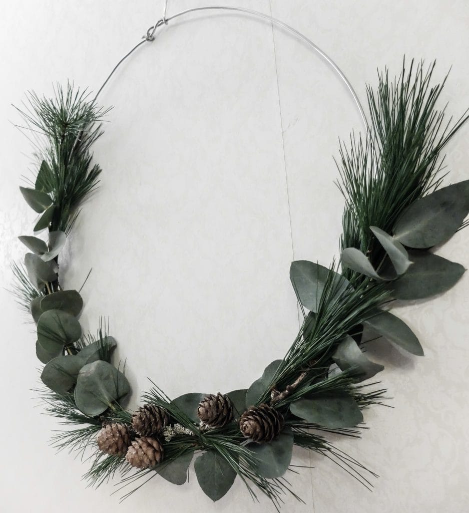 Jag gillar verkligen de trendiga stilrena kransarna med en stor metallbåge. Jag hade liten aluminiumtråd liggandes som är superlätt att forma, även fast den är ganska tjock. Jämnade till den någorlunda och knöt sedan fast tallen med blomstertråd och sedan eucalyptus och lite kottar på det.