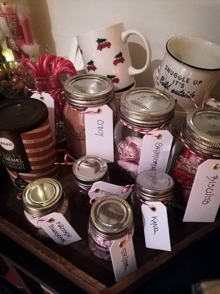 Sen placerar jag allting vid min bar och ställer upp det fint. Sen är det bara att njuta. Både av hur det ser ut och innehållet. Jag tänker lägga till några saker jag ännu inte gjort och det är chokladskedar. Skedar doppade i choklad som man sen sänkare ner i den varma mjölken. Jag ska även köpa sprutgrädde och ställa i kylen. Jag ska nog dessutom köpa Dumle som man kan även de kan lägga ner i mjölken för att smälta. Så gott.